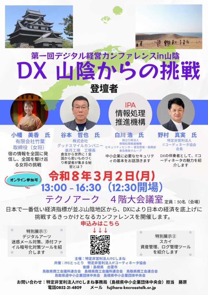この度、特定非営利法人ITCしまね様の主催で「第1回デジタル経営カンファレンスin山陰」が、2026年3月2日に、テクノアーク(島根県・松江市)で開催されます。オンラインでの参加も可能ですので、多くの方の参加をお待ちしております。 ITC鳥取も共催として協力させていただいております。